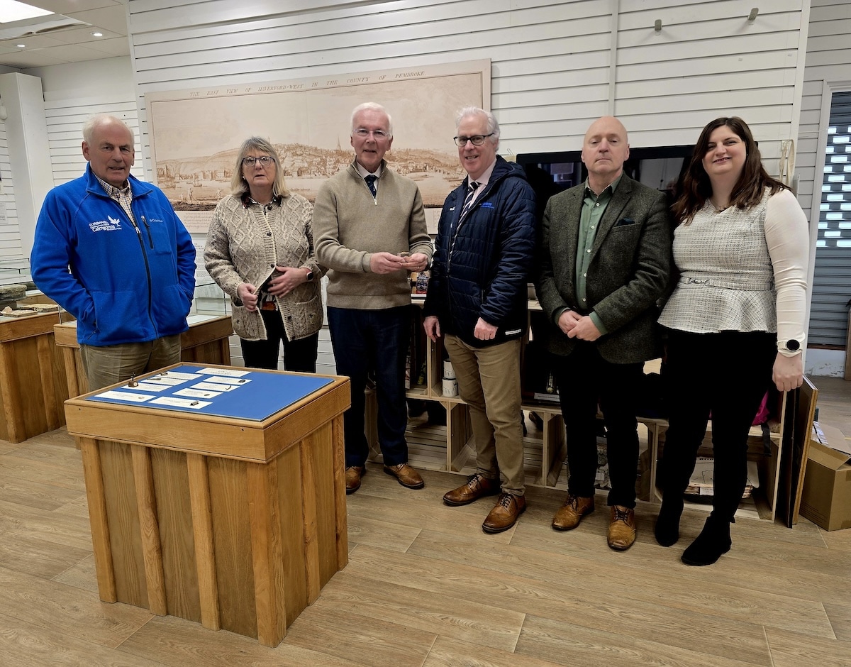 Ted Sangster, (chair of Haverfordwest  Castle CIO), Lesley Turner, (museum treasurer), Tim Evans( chair of museum trustees) , Stephen Thornton (Valero), Dr Simon Hancock  (museum curator), Bethany Hope ( museum volunteer and social media manager).