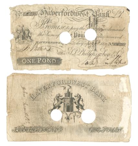 The Bankruptcy commissioners met at the castle Inn from time to time to receive proof of debts owned by Nathaniel. The great majority of the surviving notes issued by the Haverfordwest Bank bear two large cancellation holes with various printed endorsements including ‘At the castle Inn, Haverfordwest, 3 March 1826, exhibited to us under a commission of bankruptcy against Nathaniel Phillips.’ Eventually note holders received back 11 shillings and 4 pence in the pound thanks to the liquidation of the estate. An interim dividend of eight shillings was made to creditors upon application at the late Banking House in High Street in November 1826.